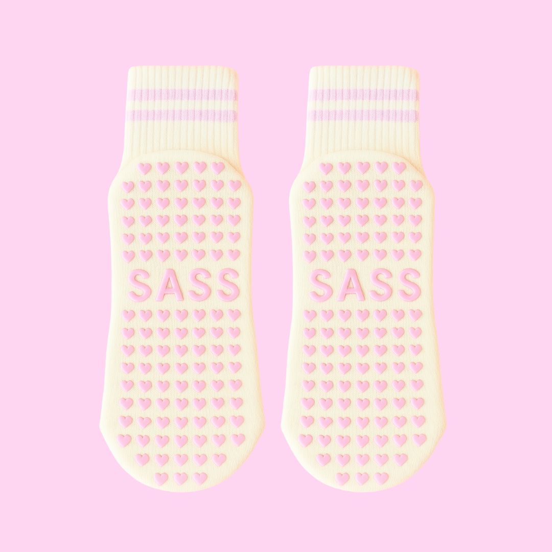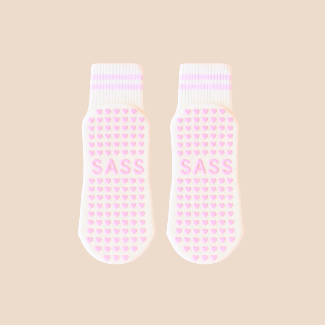 Bring sunshine energy to your sessions with these cream and pink Pilates sock, complete with playful pink stripes and pink heart grips on the sole. Soft, secure, and made to stand out – perfect for those who love a girly twist on their fitness look.